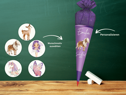 Schultüte aus Stoff personalisiert lila | Mit Namen & Wunschmotiv | Für Mädchen & Jungen
