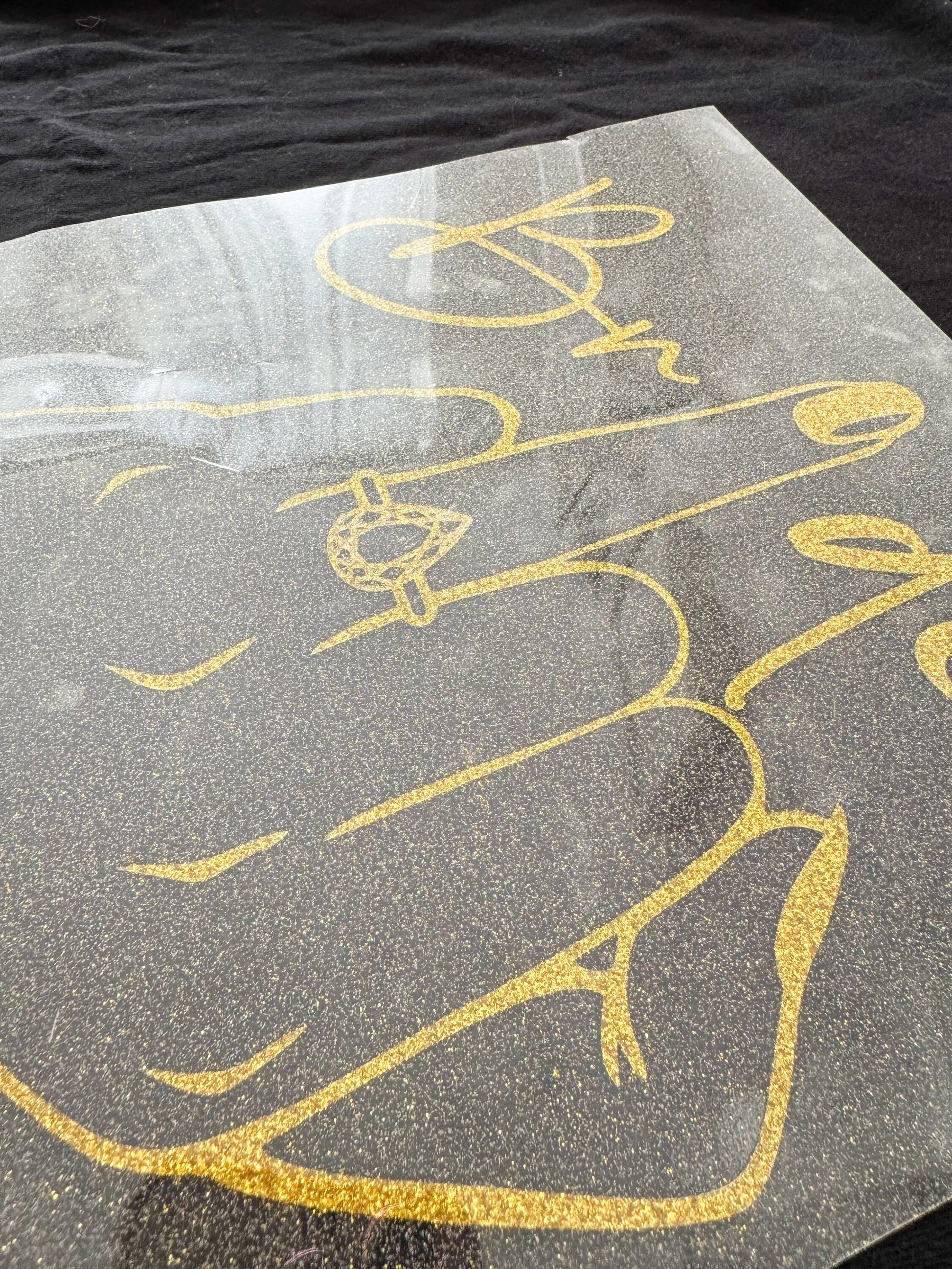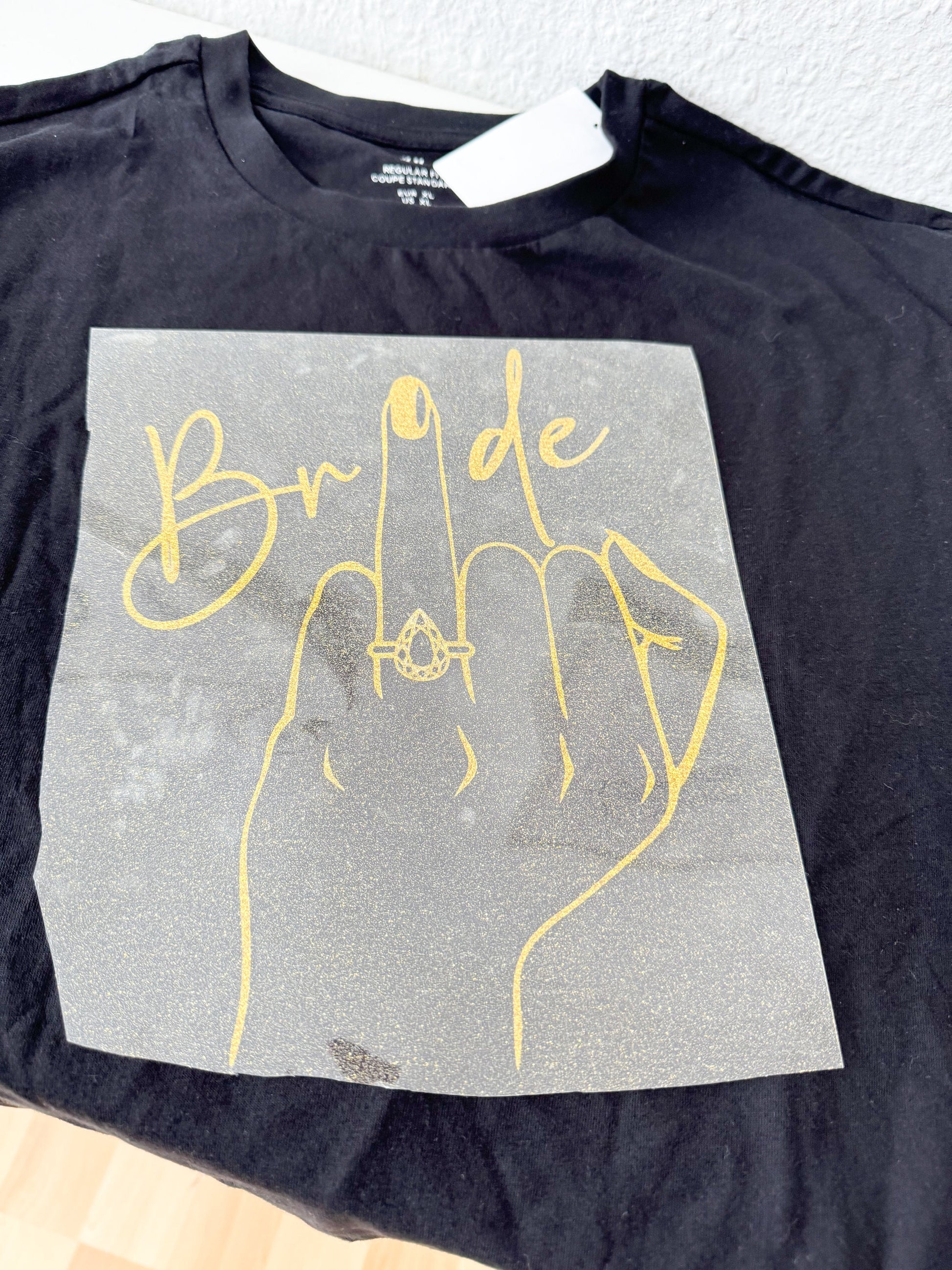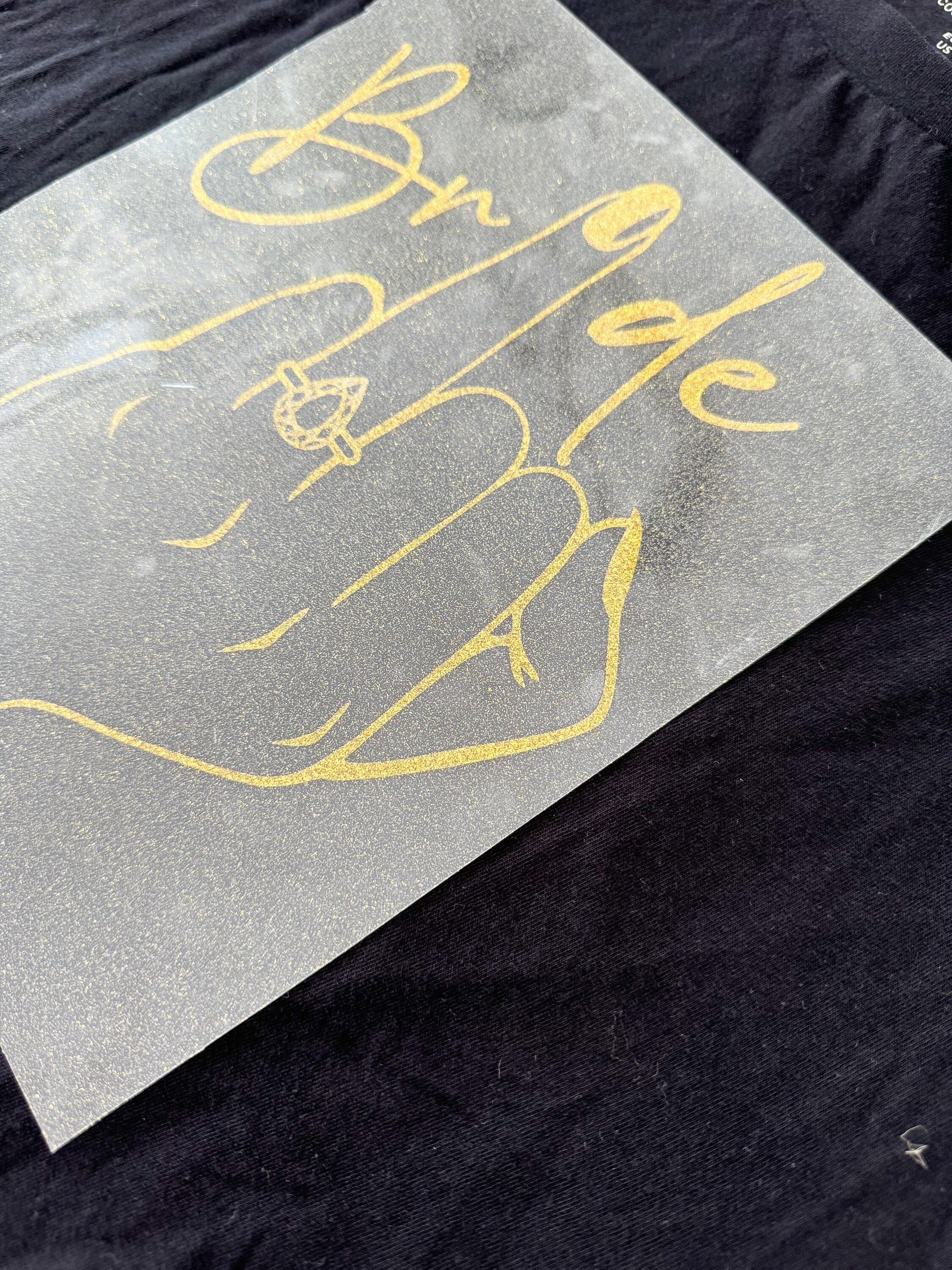 Ein elegantes Flexfolie-Bügelbild mit dem Schriftzug „Bride“ und stilvollem Ringfinger-Design – ein echter Hingucker für den Junggesellinnenabschied oder die Bridal Shower.