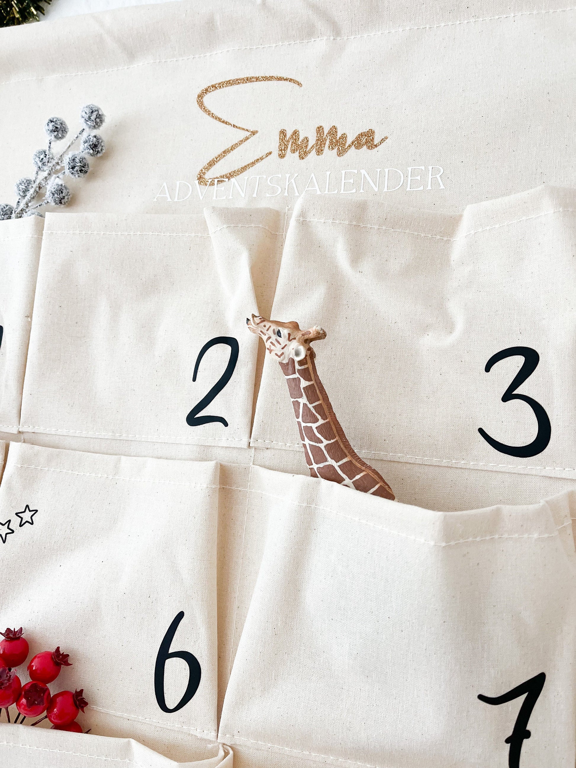 Der stabile Stoffkalender in neutralem Beige hat 24 leere Taschen zum Selbstbefüllen und Gestalten. Ideal für Familien mit mehreren Kindern – durch die Personalisierung gibt es keine Verwechslung. Du kannst die Farbe der Zahlen frei wählen, deinen Wunsch-Namen hinzufügen oder zusätzlich den Schriftzug „Adventskalender“ aufbringen.
