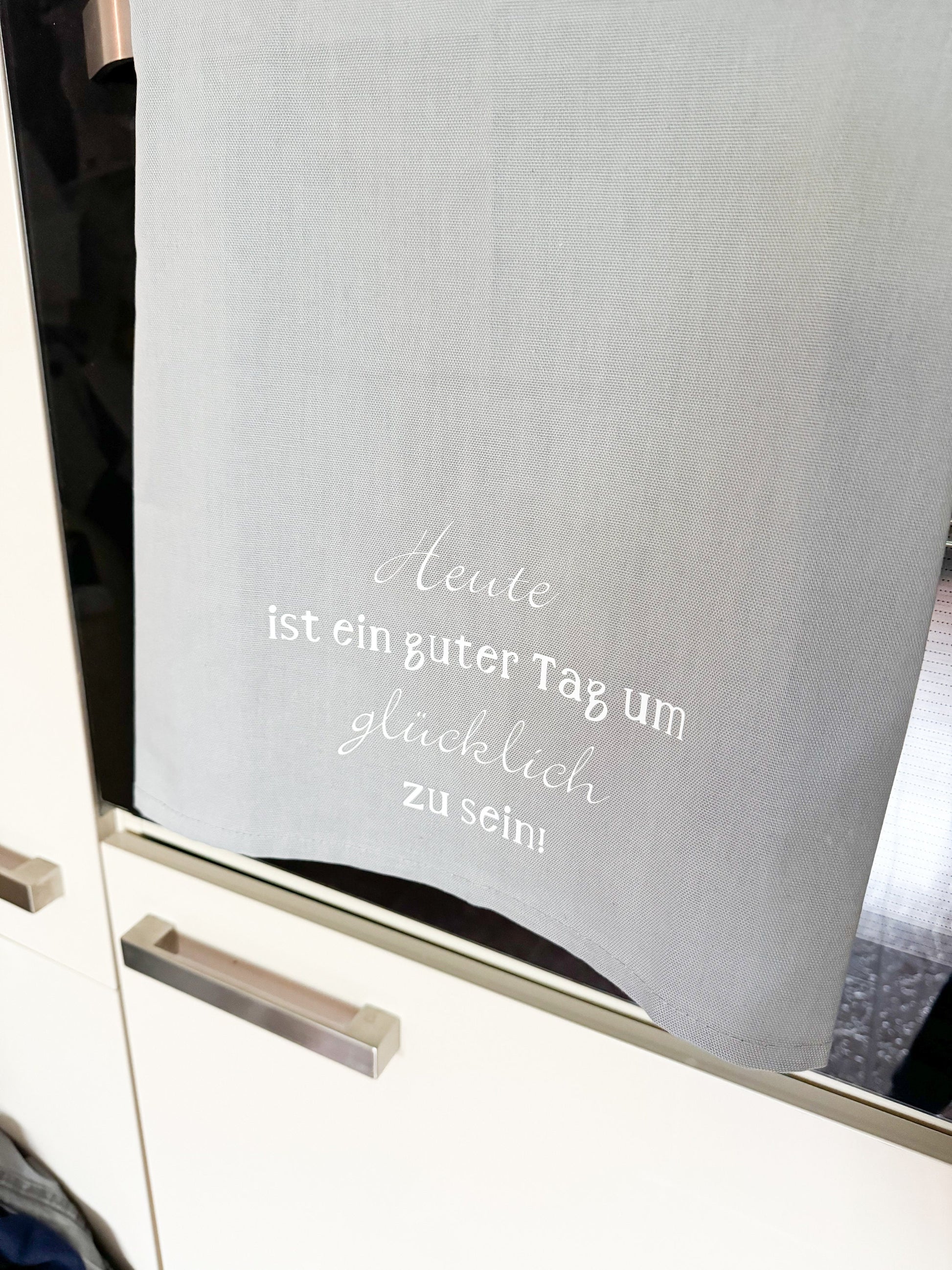 Dieses Küchentuch mit dem Affirmationsspruch „Heute ist ein guter Tag um glücklich zu sein“ ist nicht nur ein echter Hingucker in der Küche, sondern zaubert einem auch immer ein Lächeln ins Gesicht.