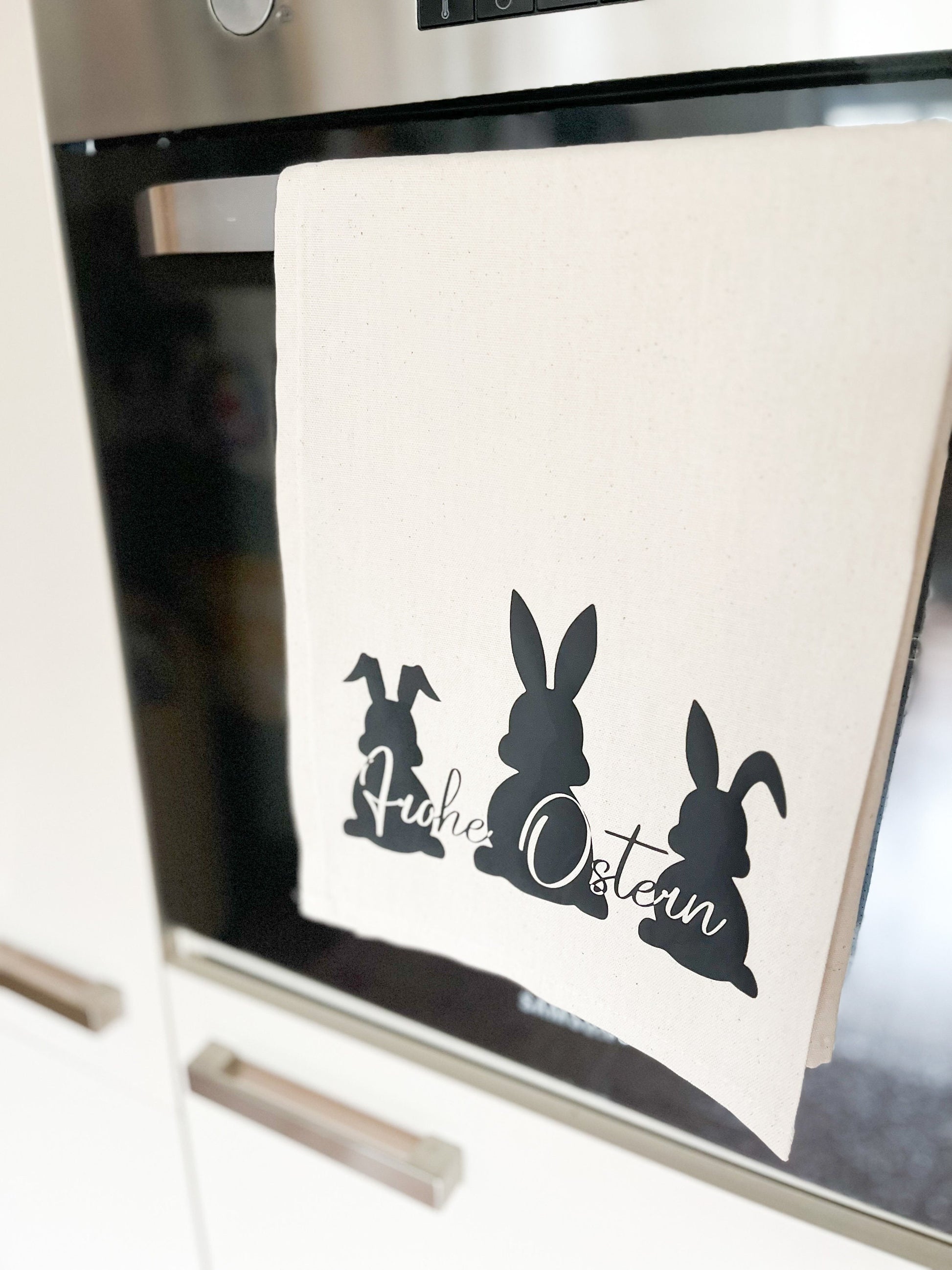 Dieses Osterküchentuch ist ein echter Hingucker in der Küche.
