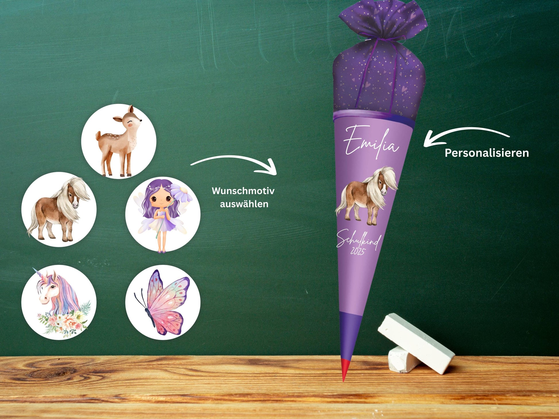 Schultüte aus Stoff | Wunschmotiv | Personalisiert mit Namen | Wunschname | Mädchen | Lila